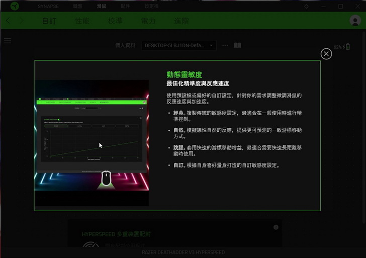 ▼ 一開啟還會跳出視窗,提示 Razer DeathAdder V3 HyperSpeed 有著 動態靈敏度 可以讓使用者設定。