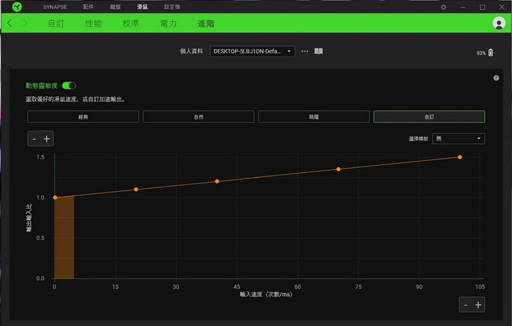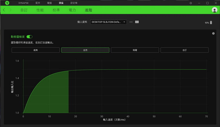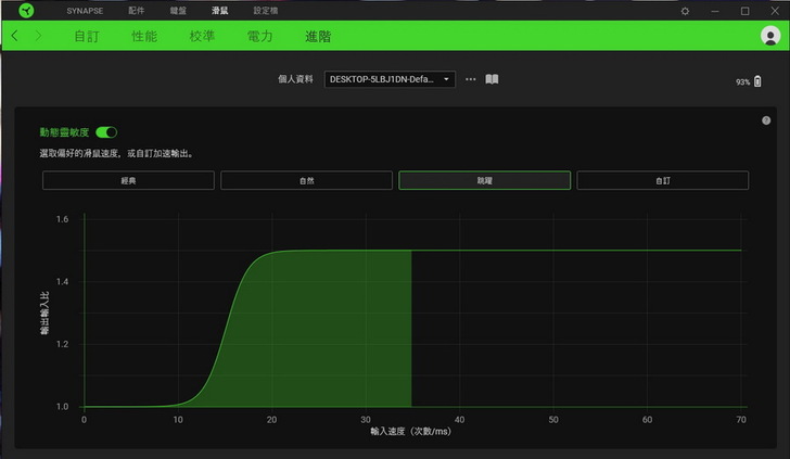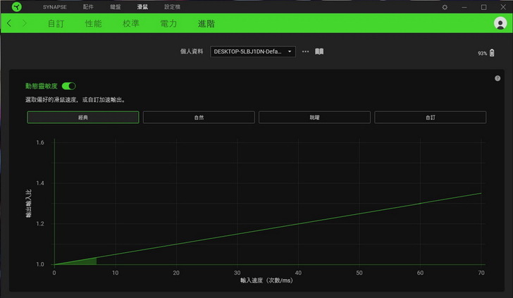 ▼ 開啟 動態靈敏度 之後,可以經由 經典、自然、跳躍 來選取適合自己的設定值。