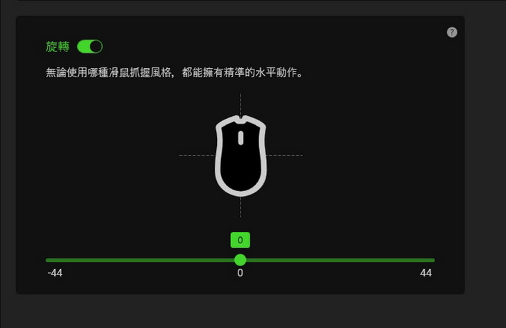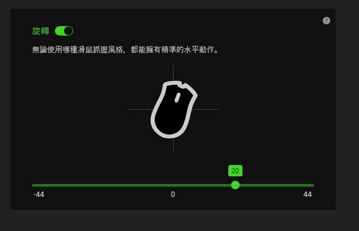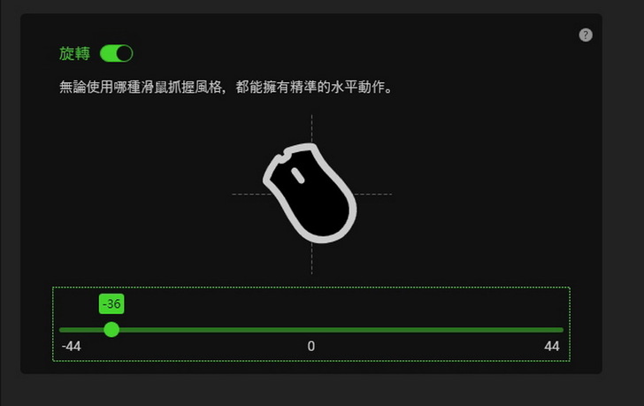 ▼ 開啟 旋轉 之後,可以滑動下方來設定滑鼠朝左或朝右,適合會用不同角度來抓握滑鼠的人。