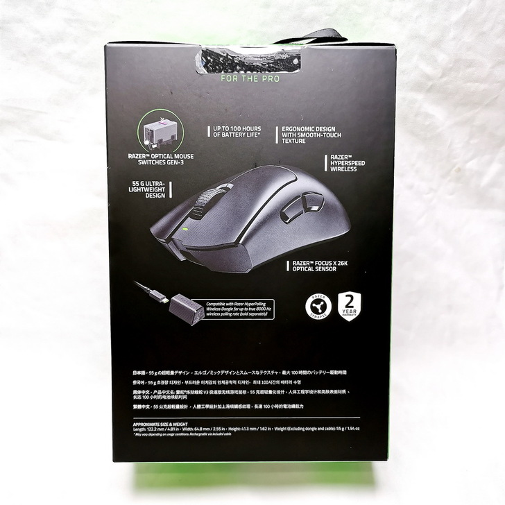 ▼ 盒裝背面同樣列出了 Razer DeathAdder V3 HyperSpeed 諸多特色,左上角特別圖示 第三代 RAZER 光學滑鼠按鍵軸,產品有著兩年保固。