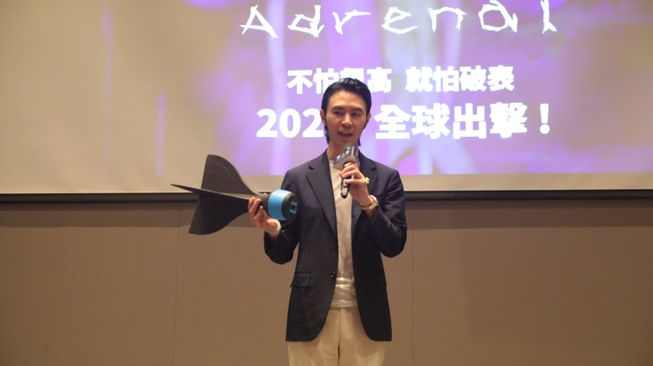 正成集團副總經理丘紘豪宣布將在電影《腎上腺》中使用最新的科技技術進行拍攝,他手持GOPRO火箭,形容可以用拋物線、空拍方式攝影並抗摔防水。(圖/陽科國際提供)
