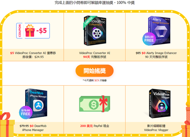 大家好!VideoProc Converter AI 正在舉行 6 週年限時優惠活動!這是一款功能強大的 AI 影片增強與轉換軟體,支援影片/圖片重製、影片轉檔、壓縮、編輯、下載及螢幕錄製等多種功能。本次活動不僅有超高折扣,還可透過填寫問卷解鎖幸運抽獎,100% 中獎,並有機會贏取 200 美元的 PayPal 現金!