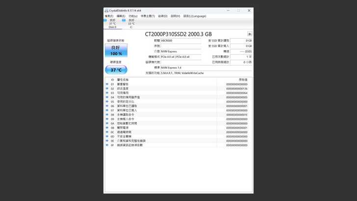首先在 CrystalDiskInfo 中,可以看到 SSD 辨識出為 CT2000P310SSD2,容量2000.3GB,運行在 PCIe Gen4 x4,韌體版本 V8CR000。