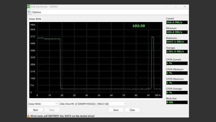 在 AIDA64 Disk Benchmark 中的 Linear Write。循序寫入開頭在 18%(約 330GB)前維持在 5,500MB/s 以上。而後就迅速掉到 350MB/s 左右,表現出 QLC 的特性。除了最後有稍微拉一波,整體速度就處於較低。最低為 286MB/s,平均仍有 1,381MB/s。QLC 本身的確是矮 TLC 一截,但若以 QLC 同級比較,其實表現不算特別差。