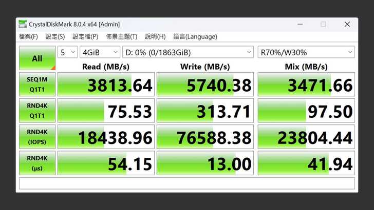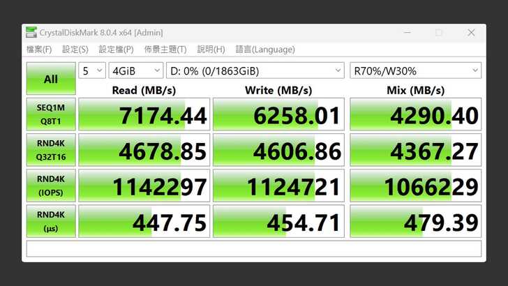 在 CrystalDiskMark 中,設定測試為五次 4GiB。最佳效能的設定下,循序讀取達到 7,174MB/s,循序寫入也有 6,258MB/s,混合讀寫也能達到 4,290MB/s,看起來相當不錯。RND4K IOPS 也表現很好,讀取、寫入、混合都在 1M 以上。