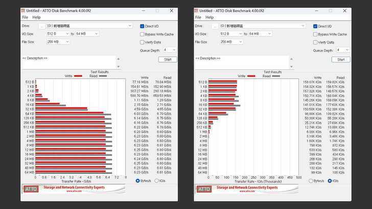 在 ATTO Disk Benchmark 中,循序寫入速度在 6GB 以上,讀取也接近 7GB。在 IOPS 方面,在較小 I/O 也有很不錯的發揮,並沒有明顯斷層。且大概都在 150K IO/s,表現很好。