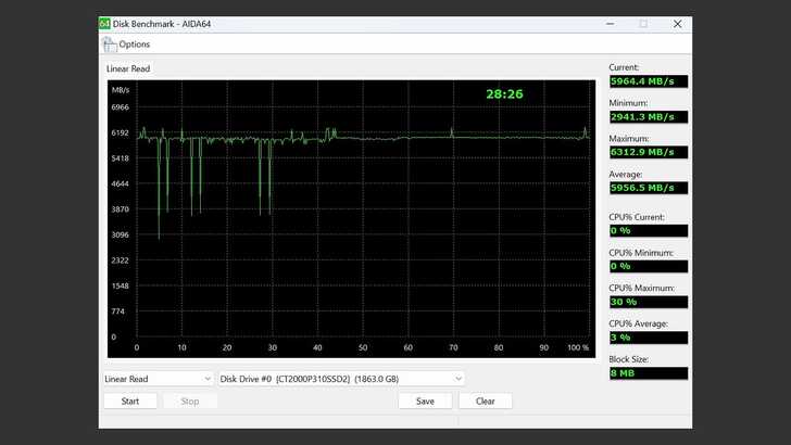 在 AIDA64 Disk Benchmark 中的 Linear Read,循序讀取看來一開始有比較明顯的短暫掉速,但後面看起來都滿穩的,平均達到 5,956MB/s。以循序讀取來說,表現還算不錯。