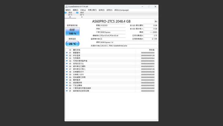 首先在 CrystalDiskInfo 中,可以看到 SSD 辨識出為 AS60PRO-2TCS,容量2048.4GB,運行在 PCIe Gen4 x4,韌體版本 V1223C0。