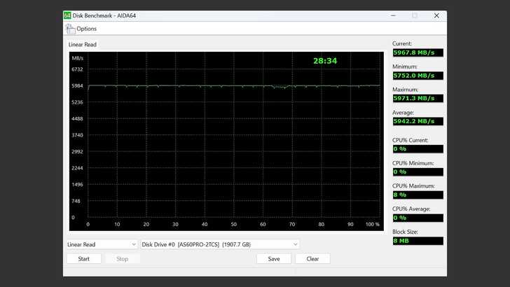 在 AIDA64 Disk Benchmark 中的 Linear Read,Block Size 為 8MB。速度表現非常穩定,速度也接近 6,000MB/s。全碟讀取平均值為 5,942MB/s,容量為 1907.7GB。