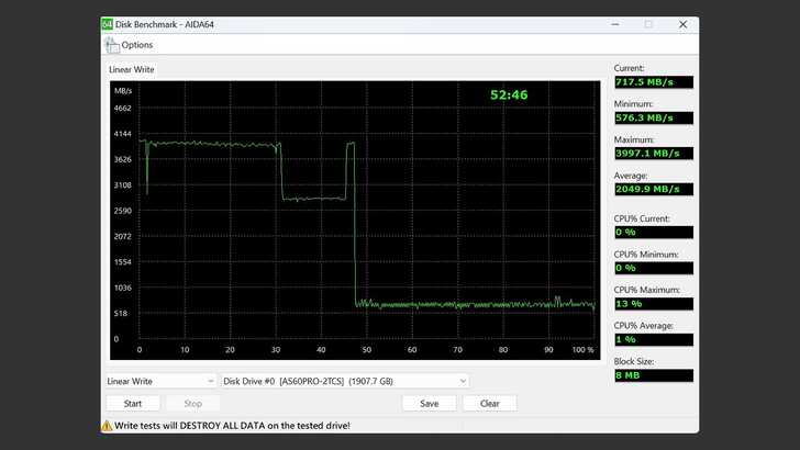在 AIDA64 Disk Benchmark 中的 Linear Write,Block Size 設為 8MB。初始約在 4,000MB/s。在寫入大約 31% 後,速度開始有幅度,掉到 3,000MB/s 左右。在 47% 左右後掉到 600MB/s 附近,最終平均仍有 2,000MB/s 的水準,耗時 52:46 跑完全碟寫入。