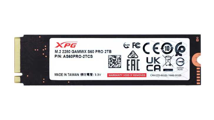 背面可以看到標籤貼紙,標示著 M.2 2280 GAMMIX S60 PRO 2TB,型號是 AS60PRO-2TCS。產地 Made in Taiwan,並且有撕毀保固無效的標語。S60 PRO 原廠保固五年,比較意外的是 TBW 標得不多,幾乎是 QLC 的等級。