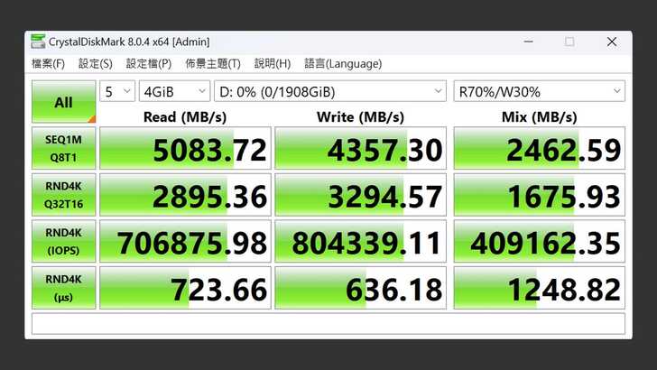 在 CrystalDiskMark 中,設定測試為五次 4GiB。最佳效能的設定下,循序讀取速度超過 5,000MB/s,循序寫入速度也有 4,357MB/s,混合讀寫速度則為 2,462MB/s。