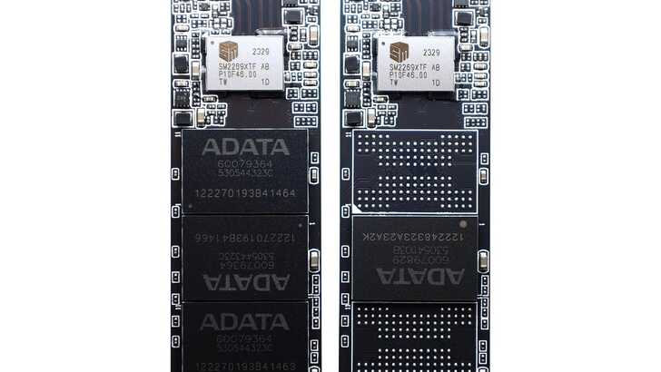 左邊是 S60 PRO 2TB 版本,NAND Flash 為 ADATA 自封顆粒,經查為 Micron 176L B47R,為 TLC 規格,共四顆。其中兩顆標示著 60079364 530544323C 122270193B41464,另為兩顆標示 60079364 530544323C 122270193B41466。左邊是 S60 PRO 1TB 版本,只有兩個顆粒。