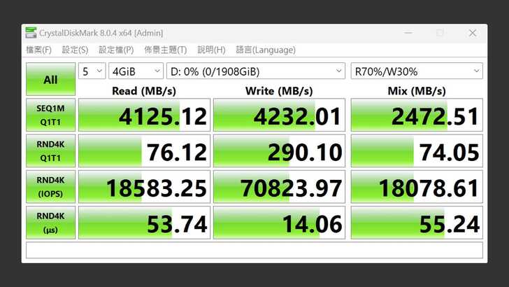 接著在 CrystalDiskMark 中,同樣設定測試為五次 4GiB,改為在真實世界的設定。循序讀取速度雖然略有下降,但依舊有 4,125MB/s。循序寫入速度則維持差不多的 4,232MB/s。混合讀寫速度也跟原本差不多,為 2,472MB/s。