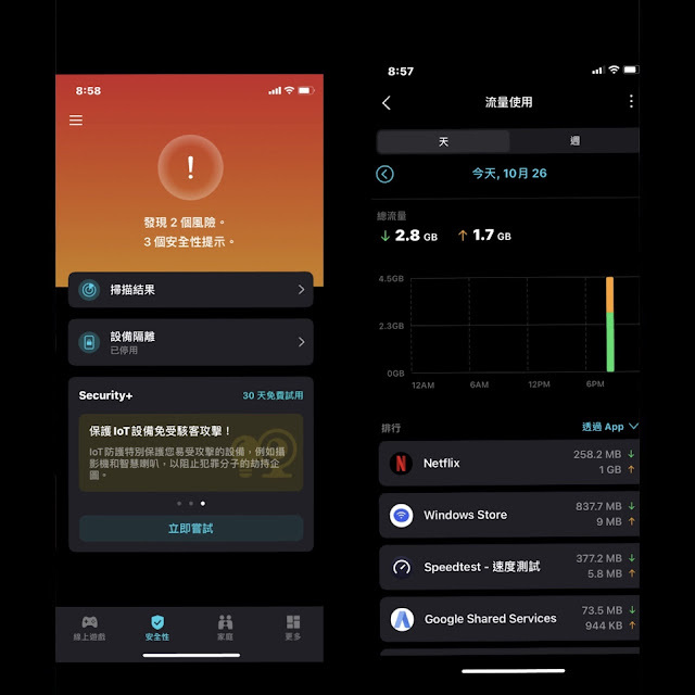 上面那個功能(Network checking)開始啟動之後,就會幫你偵測你的網路有什麼風險存在,app介面就可以看到以下畫面,細節就不展示了。