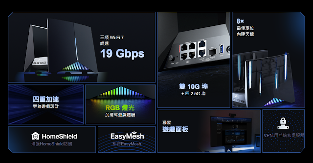 Archer GE800 BE19000三頻Wi-Fi 7電競路由器的功能設計非常強大,以下是我認為最吸引人的幾個特色:
