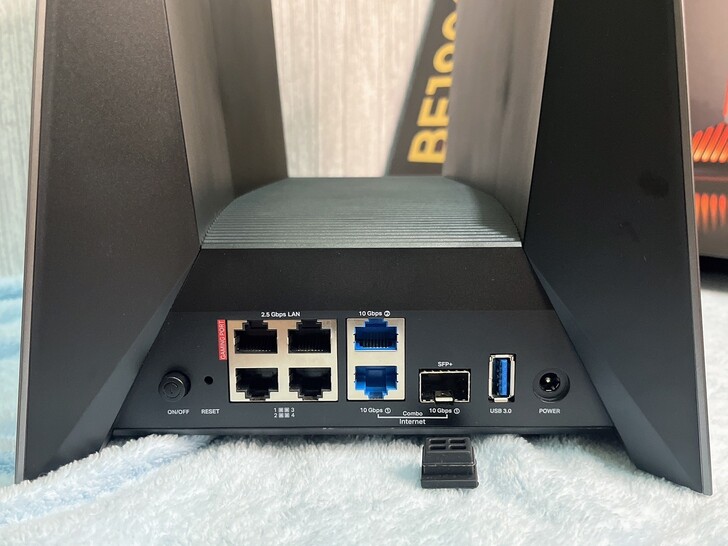 在路由器的背面,我們可以看到兩個10Gbps的連接埠和四個2.5Gbps的連接埠,這樣的設計讓我能夠靈活連接各種設備,無論是電腦、遊戲主機還是其他智能設備。這不僅提升了使用便捷性,還讓我在不同的使用場景下都能保持連線的穩定性。