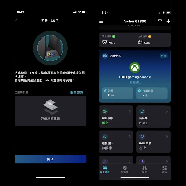 還有針對遊戲主機專用的連接LAN孔,可以減少網路延遲的問題,還可以看你的遊戲數據,以及其他連線品質跟連線裝置的狀況。都可以一目瞭然的呈現在手機上。