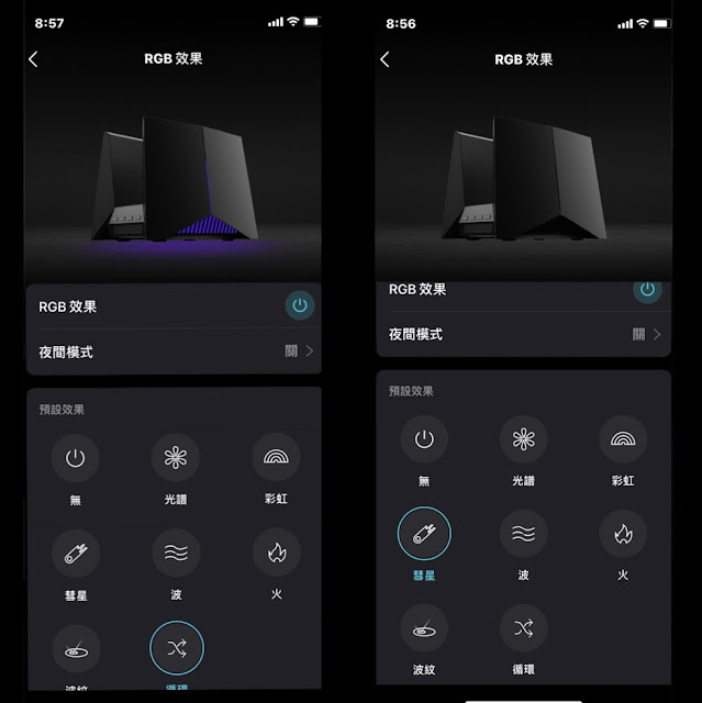 RGB效果,有很多模式可以選擇,可以開啟不同的燈光效果,而當你在app介面上選擇的時候就看到燈光的模擬效果。