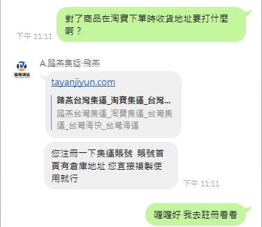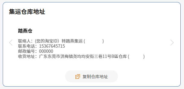 在淘寶買完東西要下單時會需要填寫收貨地址,這時候就要輸入集運倉庫的地址,可以直接到踏燕中帳號首頁複製倉庫地址
