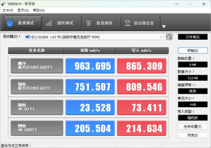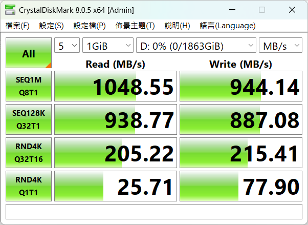 讀取約 963~1048MB/s 寫入 865~944MB/s區間
