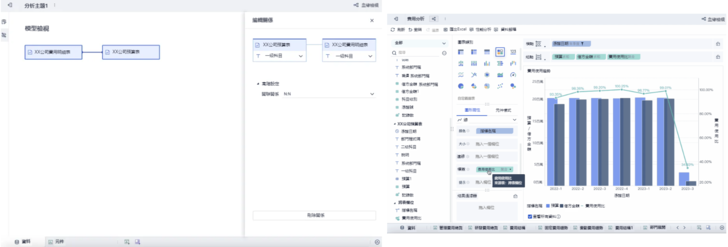 但在BI中,我們不用再煩惱這個問題。以FineBI爲例,我們可以利用其主題模型功能,能夠快速在模型檢視中,建立起表與表之間的關聯關係。財務可以直接拖拽來自不同表的跨表字段進行計算、分析,實現僅在分析時根據維度自動進行必要的合併、聚合計算,遠離過多的大寬表。