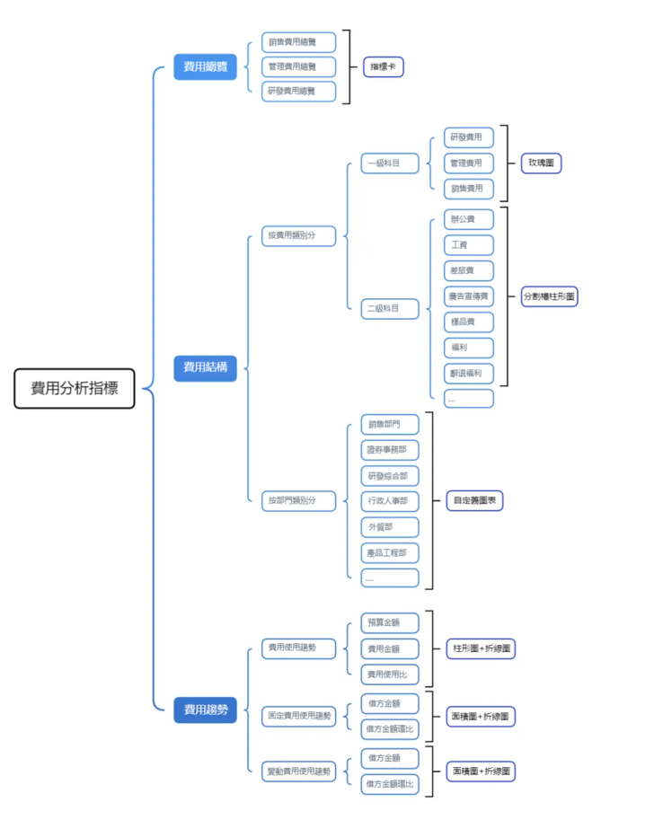 以本次費用分析看板為例,我們可分為以下3個模組,提前規劃好要展示哪些指標、指標資料從哪來、用哪些圖表型別展示資料。