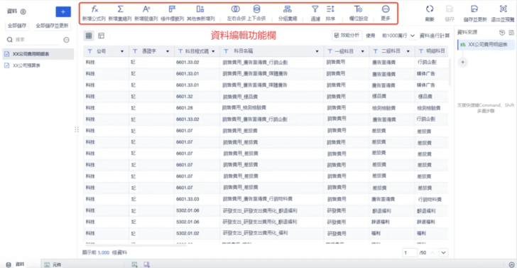 在BI工具內,與Excel類似,資料編輯功能欄位於表格上方。表格左方為表格切換區域,相當於Excel的sheet工作表。而表格右方,則為歷史操作步驟記錄區域,可清楚記錄你在這張表格中操作的每一個步驟,方便檢查、修改已做過的分析。