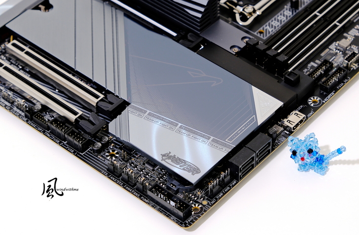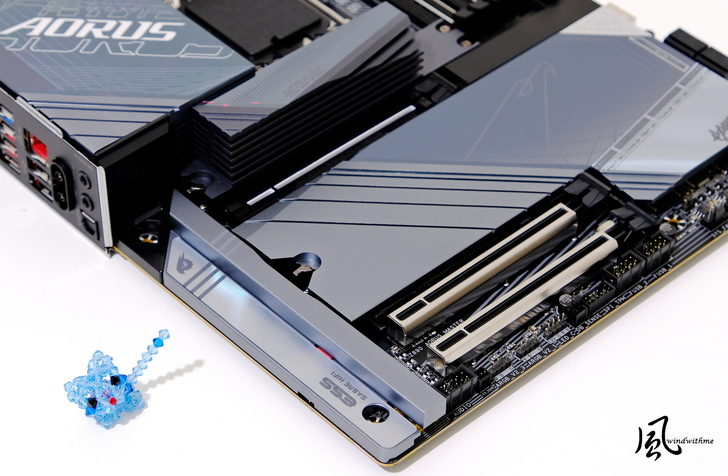 1 x Gen 5 M.2 UD Slot,左方XL散熱模組支援M.2 EZ-Latch Click無螺絲設計與加大9倍散熱面積;左下M.2 Thermal Guard Ext金屬散熱裝甲下方提供1 x Gen 5 M.2與3 x Gen 4 M.2 Slots,支援M.2 EZ-Latch Plus無螺絲快拆設計。