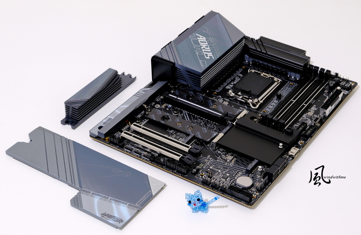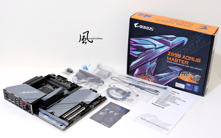 這代Z890 AORUS MASTER同樣定位為高階Z890市場,採用8層板PCB、2倍銅技術,照片中為開箱後主機板、外盒、配件全貌。
