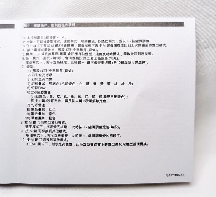 •內附Addressable RGB LED控制盒,具有10種燈光模式,可調節燈光亮度與速度