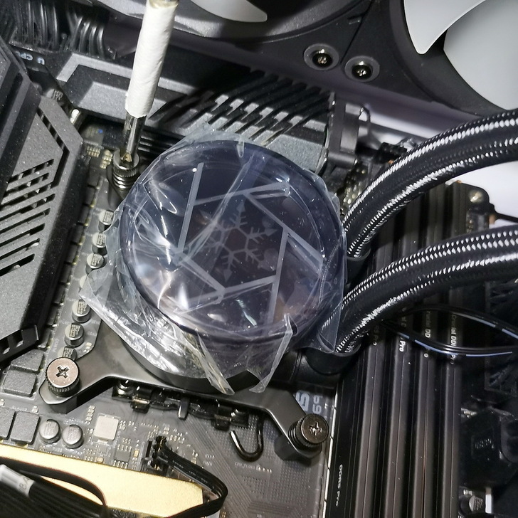 ▼ 4個水冷頭螺絲 對角依序慢慢銷上,可以看到其設計完全不會卡到旁邊的記憶體。
