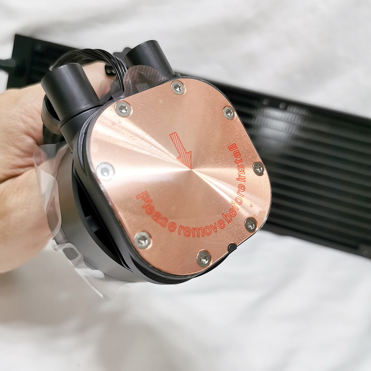 水冷頭透明外殼有貼保護膜,建議可安裝完後再撕下,不然容易刮傷。