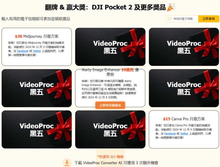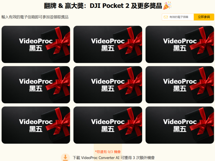 2. 輸入有效郵箱,即可獲得3翻牌機會。下載VideoProc Converter AI,再獲得額外3次機會。