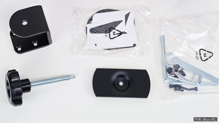 我這次選擇的款式是桌夾式的,也有穿孔式的款式。包裝內會附上這塊黑色厚實的金屬固定片,僅需將其鎖在螢幕架上,總共四顆螺絲需要鎖好鎖滿。