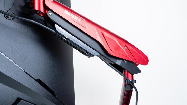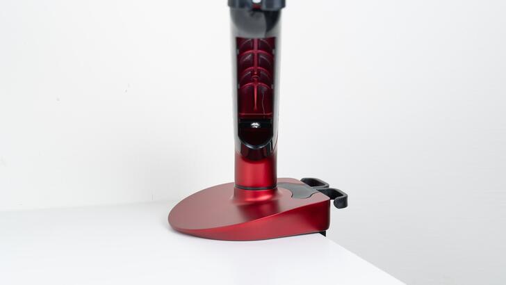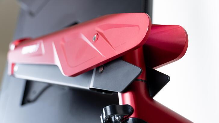 表面是磨砂工藝的豔紅色噴漆,搭配底下的鋁合金呈現出金屬高級的質感,顏色一致且均勻,磨砂的觸感一致,看上去很賞心悅目。但是,要特別注意不要撞到牆壁,不然螢幕架刮傷的痕跡很令人心痛。
