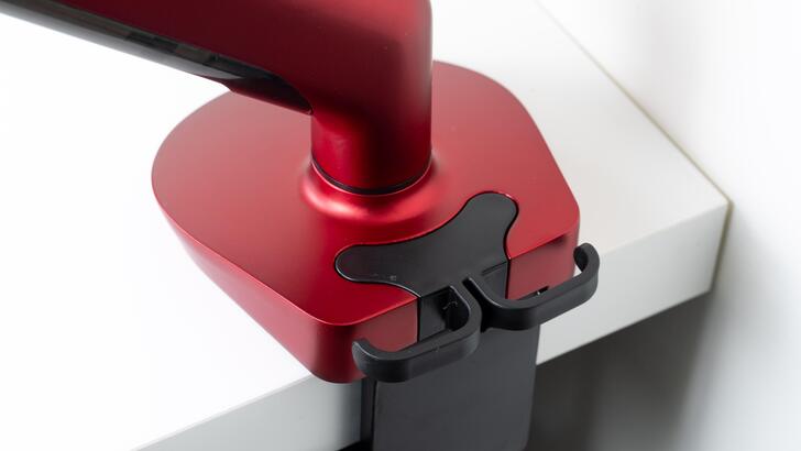 之後,再透過手轉螺絲夾緊桌子即可完成螢幕架的固定,其中桌夾式桌面厚度支援 10~43mm。