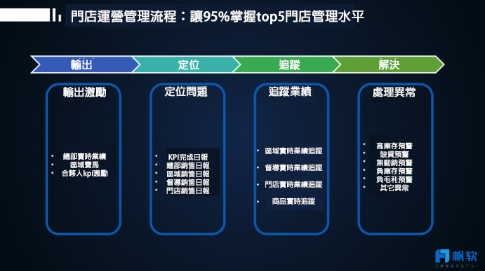 傳統零售企業的門店管理常受限於經驗式操作,不僅管理水準參差不齊,且無法系統沉澱優秀經驗。若能透過BI報表分析,持續改善管理流程,不僅可提升經營效率,也有助於縮小不同門店管理水平間的差距。以門店運營為例,可通過KPI激勵、門店銷售日報來確定經營瓶頸,並制定解決措施,最終提升門店整體管理能力。