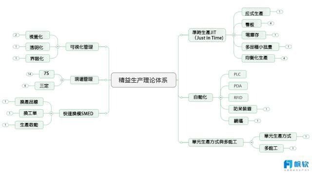 精實生產理論包括準時生產、自動化、單元生產方式、多能工、快速換模(SMED)、現場管理及資料視覺化管理等部分。智慧製造的一些實踐也從中借鑒了自動化、快速換模及視覺化管理等模塊。
