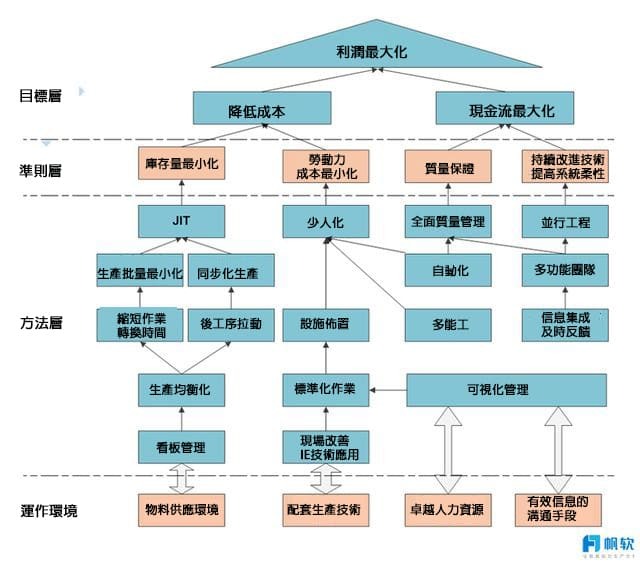 精實生產的實現離不開「精實屋」的搭建。精實屋由四層結構組成:地基層(運作環境,如人、機、料、法、環等),主體層(方法層,涉及構建細節),承重層(準則層,四大準則支撐結構),以及頂層(目標層),目標層致力於透過降低成本、優化現金流實現利潤最大化。