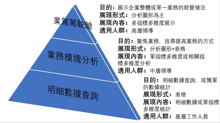 金字塔模型將數據分析平台分為三層:企業級領導的戰略駕駛艙、業務模塊管理分析及基層業務數據查詢。層級明確的設計可避免不同層級間指標展示樣式的矛盾,提高報表效能。