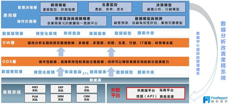 以「54321」協同管理模式搭建開放共享的數字化平台,透過ETL工具實現數據的抽取、清洗及轉化,構建ODS層與DW層,突破數據孤島問題,實現數據高效管理及利用。