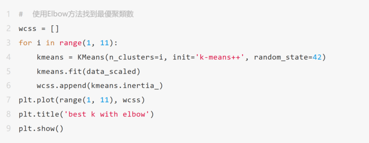 以上程式碼實現了使用Elbow方法尋找最佳聚類數的過程,將結果儲存在列表wcss中,並繪製了“肘部”圖,以便我們選擇最優的聚類數。在影象中,橫軸為聚類數,縱軸為WCSS(Within-Cluster-Sum-of-Squares),代表聚類結果的總誤差平方和。我們可以透過觀察影象的拐點來選擇最優的聚類數。在本例中,我們選擇聚類數為3。