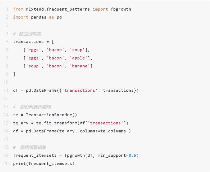 接下來,我們將使FP-growth演算法來查詢頻繁項集。以下是Python程式碼: