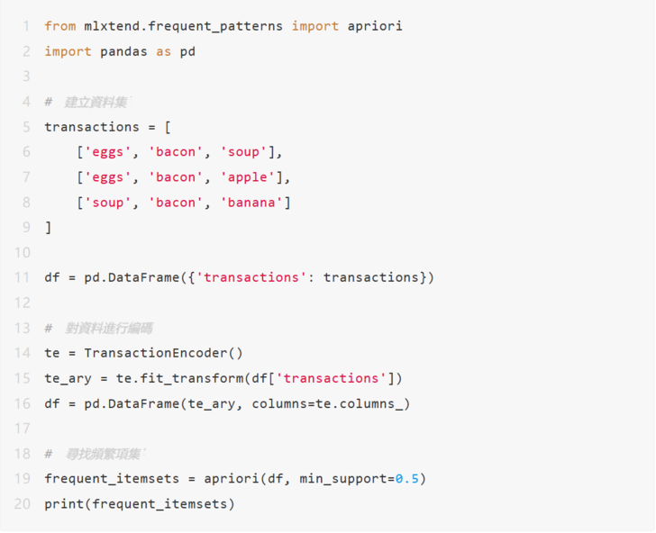 以下是一個使用Apriori演算法查詢頻繁項集的Python程式碼示例:
