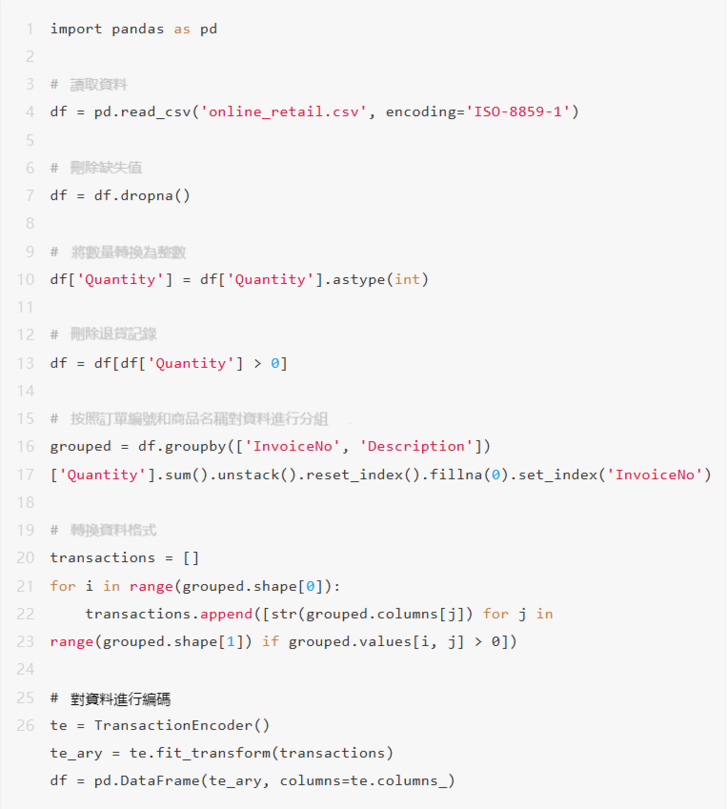 我們首先需要對資料進行預處理,以便使用關聯規則演算法。以下是資料預處理的Python程式碼: