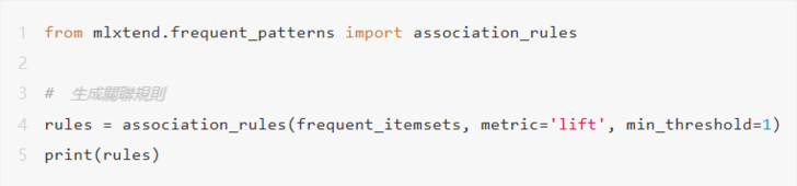 我們可以使用關聯規則演算法生成關聯規則。以下是Python程式碼: