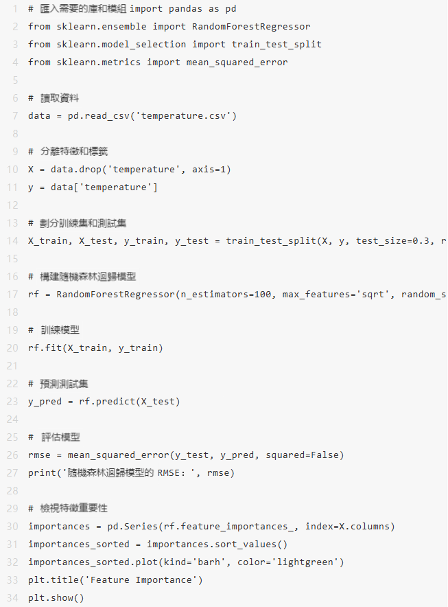 這段程式碼首先匯入需要的庫和模組,然後使用Pandas庫讀取氣溫資料。接著,我們將資料分離為特徵和標籤,並使用train_test_split函式將資料劃分為訓練集和測試集。然後,我們使用RandomForestRegressor類構建隨機森林迴歸模型,並將模型訓練於訓練集上。最後,我們使用模型在測試集上進行預測,並使用mean_squared_error函式計算預測結果和真實結果之間的均方根誤差(RMSE),透過這些指標表徵模型的預測效能。