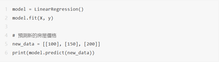 然後,我們可以使用scikit-learn庫中的LinearRegression類來訓練模型並進行預測: