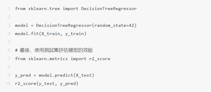 執行結果就可以計算出r2_score,透過該指標可以說明決策樹迴歸演算法對該資料集的預測效能的優劣。